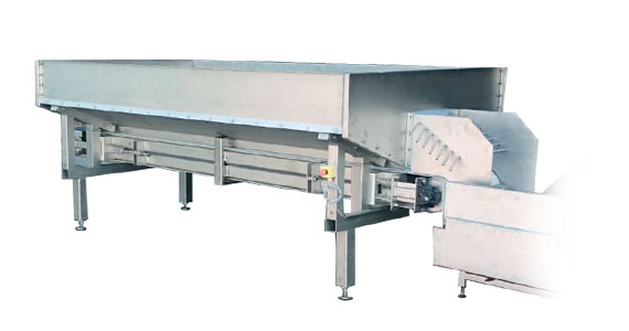 Die Standkonstruktion ist komplett aus Edelstahl gefertigt, auf 4 einstellbaren Stellfüßen aufgebaut und mit einem lebensmittelechten Kunststoffförderband ausgestattet. Die stufenlose Geschwindigkeitsregulierung und mechanische Austragsmengenregulierung mittels Stäben sorgt für die schonende Beförderung der Ware.