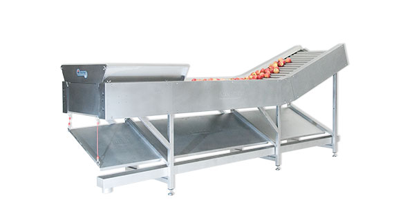 Der Rollensortierer ist auf einem Edelstahlgrundgestell mit 6 höhenverstellbaren Füssen und Rollen aus Edelstahl aufgebaut. Die stufenlos einstellbare Geschwindigkeit befördert das Obst schonend zur nächsten Maschine.