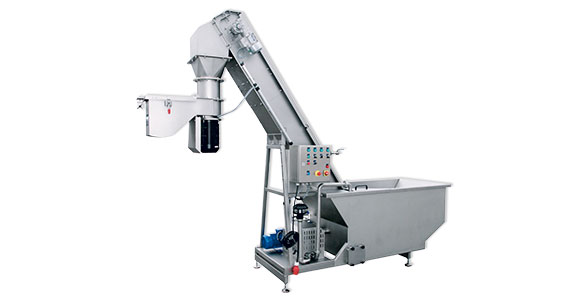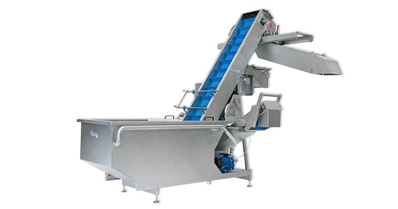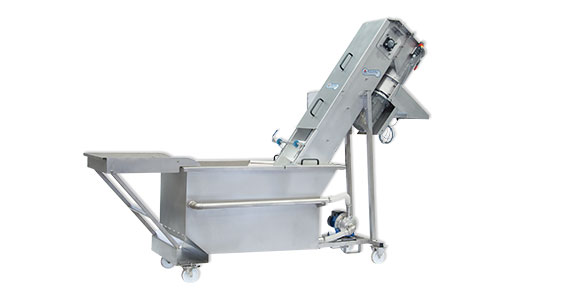 Das Obst und Gemüse wird in einen Waschbehälter geleert und einer intensiven Reinigung unterzogen. Ein lebensmittelechtes Kunststoffförderband mit stufenloser Geschwindigkeitseinstellung transportiert es nach oben, wo es mit Wasserstrahldüsen nochmals gereinigt und in die direkt angebaute Rätzmühle befördert wird. Ein zentraler Bodenablauf fängt das Waschwasser auf.