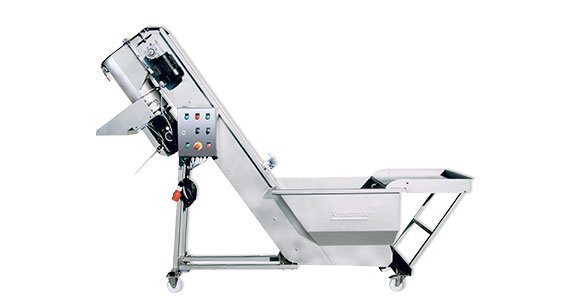 Ausgestattet mit einer stufenlosen Geschwindigkeitseinstellung mittels Frequenzumformer, automatischer Start-Stop-Schaltung für den Aufzug über eine 3-Stab-Sonde im Maischekasten der nachfolgenden Maschine (Presse, Maischepumpe,...). Edelstahlausführung auf 4 Räder.