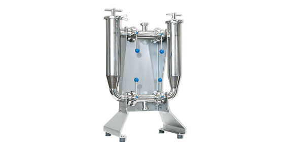 Mit diesem Gerät können grobe Partikel aus dem Saft gefiltert werden. Ohne Zeitverlust kann der eine Filter getauscht werden während der Saft zur gleichen Zeit im anderen Filter ausgesondert wird.